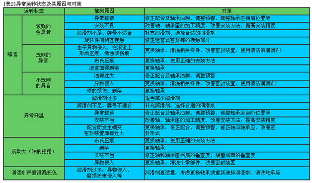 · 軸承安裝后,應(yīng)立即進(jìn)行運(yùn)轉(zhuǎn)檢查,以確認(rèn)安裝是否正確。[表1]給出了運(yùn)轉(zhuǎn)檢查的方法。若在運(yùn)轉(zhuǎn)檢查中發(fā)現(xiàn)異常,應(yīng)立即停機(jī),對(duì)機(jī)器進(jìn)行檢查,常見(jiàn)問(wèn)題的產(chǎn)生原因及對(duì)策參見(jiàn)[表2]。